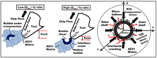 To understand the role played by the bubble contact area with the tool, a correlation between the ratio of microbubble diameter to undeformed chip thickness (Davg/h) with shear force was established (Figure 3d). The average bubble size used in this study was approx. 0.3–0.6 mm. The range of (h) values used in the test was between 0.2 mm and 0.05 mm. It was noted that as the (Davg/h) ratio increased from 1.5 to 6, the magnitude of the primary shear force decreased almost by a factor of 2.75 (Figure 3d). It can be inferred that when the undeformed chip thickness (0.05 mm) is significantly smaller than the average bubble diameter (0.3 mm), the bubble contact area with the cutting edge in the shear zone is expected to be lower. The tool rubbing effect at lower uncut chip thickness values could cause surface smearing and most probably shear the bubble as the shear strength of the ceramic bubble is much lower than its compression strength. In this mode of bubble deformation, they were subjected to shear failure and the AZ31 matrix was exposed to the applied shear load (Figure 4). This furthered the rate of AZ31matrix plastic flow through the collapse of hollow cavities thus diminishing the effective load-bearing capacity of the microbubbles. In addition to the aforementioned ineffective load transfer mechanism, the higher rate of matrix plasticity is associated with cutting temperature in the primary shear zone. Moreover, at high (Davg/h) ratios, high cutting temperatures are estimated (350 °C) due to tool rubbing leading to higher values of equivalent plastic strain and chip compression ratio. It can be inferred through the literature findings [40,41] that the twinning mechanism which dominates the magnesium matrix plasticity during lower plastic strain is replaced by dislocation slip mechanisms (such as prismatic/pyramidal slip) at a higher equivalent plastic strain. This transition in magnesium plastic deformation from twinning to dislocation slip mechanism at lower cutting feed is expected to be associated with a drop in shear stress values with increasing cutting temperature in the primary shear zone (Figure 3d).