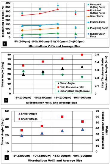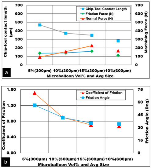The effect of ceramic hollow microballoon volume fraction and its average size on the cutting force and friction force is shown in Figure 7a. The presence of microballoons in the AZ31 matrix provides the required foam stiffness through an effective load transfer mechanism. An increase in the volume fraction of microballoons in the matrix improves the shear strength of the matrix through the effective pinning of the grain boundaries. Matrix plasticity is restricted due to the presence of a higher volume fraction of microballoons with the equivalent plastic strain reduced from 1.1 to 0.9. An increase in volume fraction means a higher number of microballoons in the primary shear zone. It is noted that as the volume fraction of ceramic bubbles goes up, the thermal conductivity and specific heat capacity properties are slightly reduced for the magnesium foam. This effect can be correlated with decreasing cutting temperature in the primary shear zone with increasing volume fraction. With lower mobility of dislocation slip mechanisms and reduced equivalent plastic strain, the shear angle increases from 20° to 26° with a corresponding increase in chip thickness ratio from 0.35 to 0.45 and normalized shear stress values (37 MPa to 60 MPa). Machining higher volume fraction foams with pronounced brittle behavior due to the presence of ceramic microballoons result in the formation of thinner discontinuous chips. The nature of chips formed shows the operation of active-matrix and interface crack propagation mechanisms where a reduction in length of the shear plane is predicted along with a substantial fall in the chip compression ratio (2.8 to 2.3) for higher volume fractions.