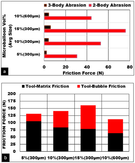 Ceramic microballoons which are still intact in the matrix and did not burst during the shearing process engages in two body abrasion along with the hardened matrix and cause a material loss on the cutting tool rake surface. On the other hand, the fragments of the bubbles which have been busted and fractured along with debonded loose bubbles cause rolling friction between the hardened matrix and tool rake face causing three-body abrasion. The friction force contribution due to the ceramic hollow bubbles ( can be shown as: