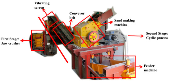 The second stage is the cyclic sand making. The blocks smaller than 50 mm are crushed repeatedly until all the aggregate has an average particle size of less than 4.75 mm. The obtained aggregate with an average particle size of smaller than 4.75 mm is called the CRFA. The equipment used in this cyclic process is composed of a feeder machine, a conveyor belt, a vibrating screen, and the PCX8040 sand making machine (hammer crusher, Guangdong Leimeng Heavy Machinery Manufacturing Co., Ltd., Guangzhou, China). During the procedure, the whole powder produced is retained in the CRFA. The equipment is displayed in Figure 1.