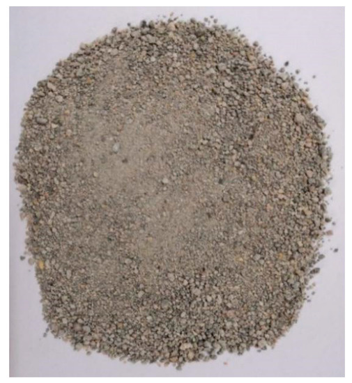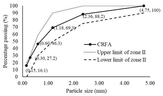 The appearance and particle grading of the CRFA produced by the procedure described in Section 2.1 are illustrated in Figure 3 and Figure 4, respectively, and its physical properties are listed in Table 3. According to code GB/T 25176-2010 [26], the CRFA is considered to be medium sand, and the particle grading is suitable and belongs to zone II; moreover, the apparent density, the bulk density, and the porosity have reached the requirement of the first-class sand; the crush index also meets the requirement of the second class sand. However, since the fine powder in the CRFA is not sieved, the content of the fine powder is high, but it satisfies the third class sand requirement. The water absorption of the saturated-surface-dry CRFA (6.4%) is smaller than that of the conventional recycled aggregate, averaging 9.9% with a standard deviation of 2.4% [30]. Overall, the quality of the produced CRFA is high.