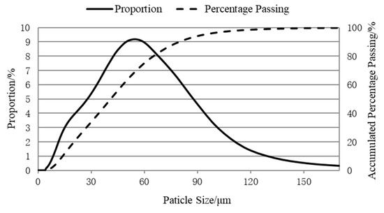 The CRFA powder with a particle size of smaller than 0.080 mm was characterized using laser particle size analysis. The particle size distribution of the powder is presented in Figure 7, and Table 4 tabulates its characteristic particle sizes. The average particle size of the CRFA powder is 44.9 μm, and 90% of the powder particles are smaller than 80.2 μm. It can be seen that 10% of the powder particles are larger than 0.080 mm, which is because the sieve method uses the diameter of the inscribed sphere of the particle, but the laser particle size analyzer measures the particle size in one direction. When the powder has undesirable sphericity, the particle size calculated by the laser particle size analyzer is larger than that measured by the sieve method, so the results of the two methods are not in agreement [31]. Fan and Wang [32] stated that the average particle size of cement is around 22 μm; thus, since the particle size of the CRFA powder is close to that of cement, we may substitute the CRFA powder for the cement to fill up the void of the aggregate system.