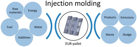 For analysis, one standard European pallet (EUR-pallet) was selected as the functional unit (FU), according to the European Pallet Association standards. It is closed-deck medium duty EUR-pallet, offered by various companies, e.g., Logistic Packaging (Bucharest, Romania) or Associated Pallets Ltd. & Plastic Pallets UK (Southampton, Great Britain) [29,30]. A schematically analyzed pallet is shown in Figure 2. The mass of the analyzed pallet is 15 kg.