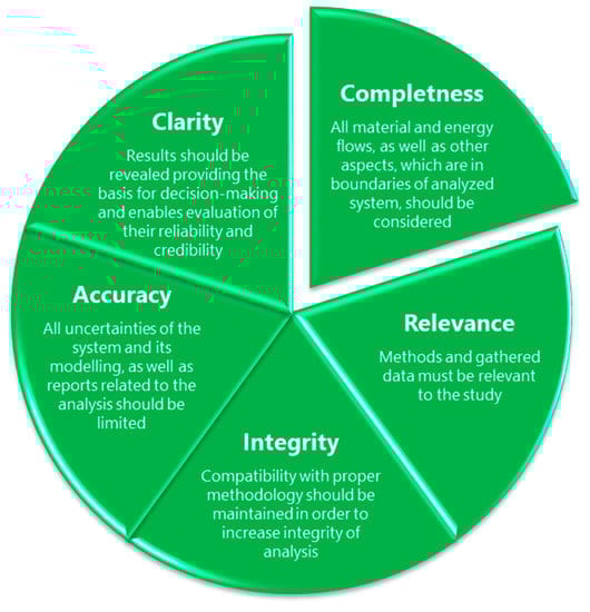 Moreover, in addition to applying the recommended proper methodology for assessing the individual environmental footprints and taking into account the physicochemical properties of the analyzed materials, assessment requires certain principles be taken into account [40]. These principles were developed to guarantee consistent, reliable, and reproducible assessments of environmental footprints. They aim to provide guidelines for analysis, similarly, as various standards related to different measuring methods, e.g., International Organization for Standardization (ISO), American Society for Testing and Materials (ASTM), or Deutsches Institut für Normung (DIN) standards. To do so, they must be taken into account during every step of environmental footprint study, from formulating the objectives of the study and determining its scope through data collection, environmental impact assessment, and reporting, to verify the assessment results. Schematically, they are presented in Figure 4.