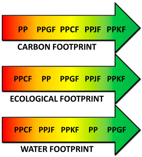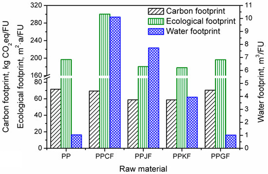 Having in mind the factors mentioned above and the environmental trends focused on the enhancement of ecological aspects of plastics production, we adopted the comprehensive approach of Galli et al. [26] in the evaluation of the environmental impact of polypropylene-based natural fiber composites. The presented study was aimed at calculating and evaluating the carbon, ecological, and water footprints of polypropylene and assessing their changes after partial substitution of polymer with kenaf, jute, and cotton fibers. We believe that such research works are very helpful in setting the trends in polymer and plastics technology and in answering the following question related to the health of the planet—Can the substitution of petroleum-based plastics with bio-based materials result in the manufacturing of engineering-useful materials and simultaneously reduce their environmental impact?
