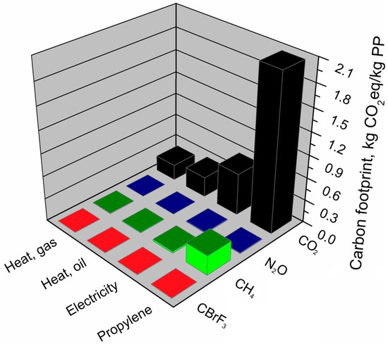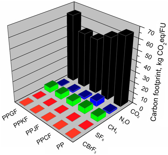 The analyses carried out allowed the assessment of the carbon footprint value of the model product in various material variants. It was indicated which greenhouse gases were emitted from individual production systems and what is their share in the total carbon footprint, expressed in CO2 equivalent. The carbon footprint of EUR-pallets manufactured by injection technology from various raw materials, in most of the material variants analyzed, was at a similar level, except for biocomposites reinforced with jute and kenaf fibers. In these variants, the carbon footprint was smaller than the other analyzed variants and took the values of 58.70 and 58.57 kg CO2eq/FU, respectively. The highest value of this indicator—71.53 kg CO2eq/FU—was observed for a pallet made of polypropylene. A similar carbon footprint had EUR-pallets made of glass fiber-reinforced polypropylene (PPGF)—70.35 kg CO2eq/FU and cotton fiber reinforced polypropylene (PPCF)—69.39 kg CO2eq/FU. As can be seen in Figure 7 presenting a share of particular GHGs in the total carbon footprint, carbon dioxide emissions showed the most significant impact. Their share in the total carbon footprint of the following material variants: PP, PPGF, slightly exceeded 90%. This was probably because polypropylene and glass fibers production belong to energy-consuming technological processes. Also, these processes are mainly based on non-renewable raw materials [56]. In the PPCF, PPJF, and PPKF material variants, the CO2 share in the carbon footprint was in the range of 85–88%. It has been shown that methane emission in the analyzed material variants constitutes from 7% to 8% of the carbon footprint. The highest methane emission occurs when using pure polypropylene while the lowest in the material variant in which polypropylene is reinforced with cotton fiber (PPCF). Nitrous oxide emission also occurs in the analyzed production systems, while its share in the total carbon footprint was insignificant, and in most of the analyzed variants, it constituted from 0.5% to 3%. The exception was the variant in which polypropylene was reinforced with cotton fiber (PPCF); then, the total emission of nitrous oxide from the production system represented 8% of the carbon footprint. The other two gases shown in the analyses, sulfur hexafluoride and bromotrifluoromethane, despite a very high greenhouse potential, accounted for very little of the carbon footprint of the analyzed EUR-pallets. In total, their share in the carbon footprint of individual variants did not exceed 0.5%.
