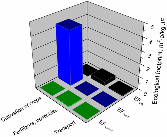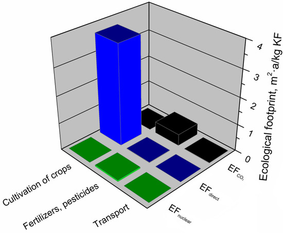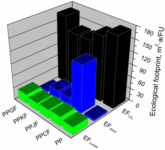 Another environmental footprint which was investigated was an ecological footprint, i.e., the measure of the Earth’s biologically productive area necessary to produce 1 kg of the analyzed material. The ecological footprint is defined as the sum of the direct and indirect Earth surface utilization associated with the consumption of nuclear energy and CO2 emissions from the consumption of fossil fuels. The ecological footprint analysis allows the determination of human demand for natural resources in the biosphere. The ecological footprint estimates the amount of biologically productive land and water surface required to compensate for resources consumed for consumption, development, treatment of part of the waste and storage of other waste, as well as for the absorption of emissions resulting from the consumption of energy from fossil fuels and nuclear energy [45].