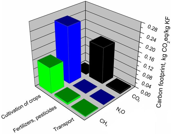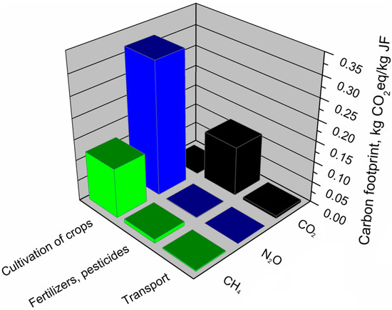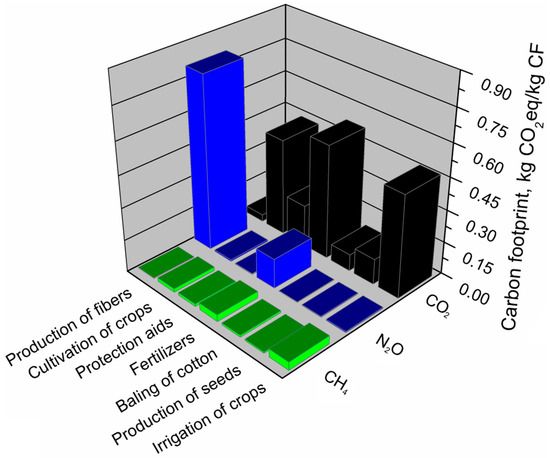 A detailed analysis of the components of their production systems that generate the carbon footprint was performed for individual materials. Table 10 summarizes the emissions of all greenhouse gases shown in the analyses. The share of individual greenhouse gases in the carbon footprint of the analyzed materials is indicated.