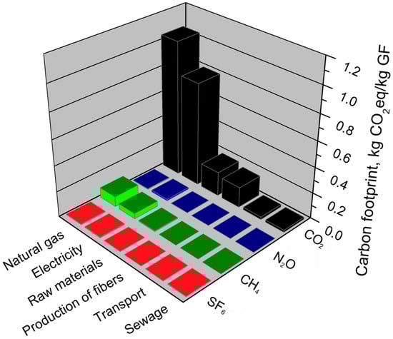 Table 9 presents the main components of the glass fiber production system that affect its environmental footprints. It can be seen that for glass fibers, the shares of individual components differred significantly between footprints. The carbon footprint of glass fibers is primarily determined by the consumption of natural gas and electricity in high-temperature glass production and processing. Total greenhouse gas emissions related to energy use (heat and electricity) in the glass fiber production system accounts for 83% of the carbon footprint. In the analyzed production system, the carbon footprint is slightly affected by the stages of obtaining raw materials and producing fibers. The lowest greenhouse gas emissions come from transport and processes related to wastewater and waste management. Regarding the ecological footprint, total energy use (heat and electricity) show a similar share (84%) as for the carbon footprint. However, individual shares of electricity and natural gas are reversed. A different situation is observed for the water footprint of glass fibers production. The most significant impact on water footprint (~74%) is noted for the production and use of applied raw materials, e.g., silica, aluminum oxide, boric acid, clays, fluorite, lime, and other additives and modifiers. The significant impact of the total water footprint was also observed for the use of electricity, similarly as in the case of other indicators. For all of the analyzed footprints, the lowest shares (~1%) were observed for transport and sewage management.
