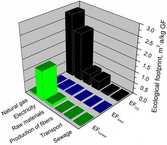 Figure 19 presents the results of the analysis broken down into individual factors included in the ecological footprint of the glass fiber production system. The figure indicates the main components of the glass fiber production system that generate an ecological footprint and shows which factors (EFdirect, EFCO2, EFnuclear) and to what extent determine the ecological footprint of glass fibers.