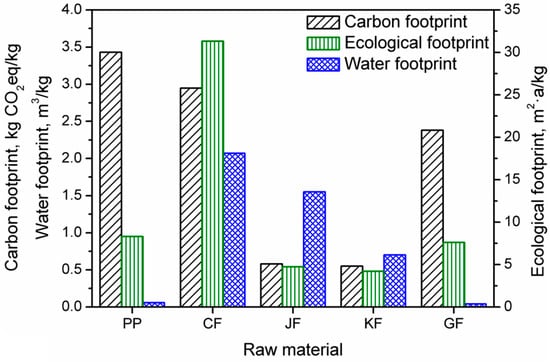 Regarding the water footprint, the highest values were noted for natural fibers, 0.70, 1.55, and 2.07 m3/kg for kenaf fibers, jute fibers, and cotton fibers, respectively. As mentioned above, it is related to the cultivation and irrigation of crops used in the production of fibers. For glass fibers, the water footprint was significantly lower—0.041 m3/kg; therefore, considering only the water footprint, glass fibers can be considered a lower environmental burden than natural fibers. For PP, the value of the water footprint equaled 0.059 m3/kg.
