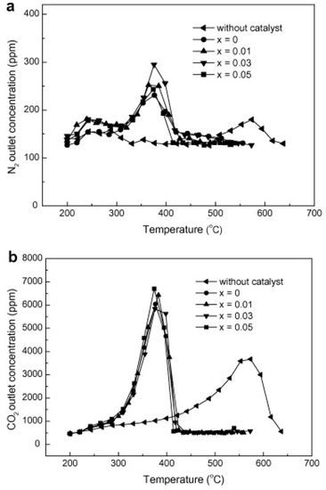 - Teraoka, Y.; Nakano, K.; Shangguan, W.F.; Kagawa, S. Simultaneous catalytic removal of nitrogen oxides and diesel soot particulate over perovskite-related oxides. Catal. Today 1996, 27, 107–113. [Google Scholar] [CrossRef]