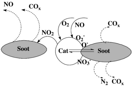 - Kureti, S.; Weisweiler, W.; Hizbullah, K. Simultaneous conversion of nitrogen oxides and soot into nitrogen and carbon dioxide over iron containing oxide catalysts in diesel exhaust gas. Appl. Catal. B Environ. 2003, 43, 281–291. [Google Scholar] [CrossRef]