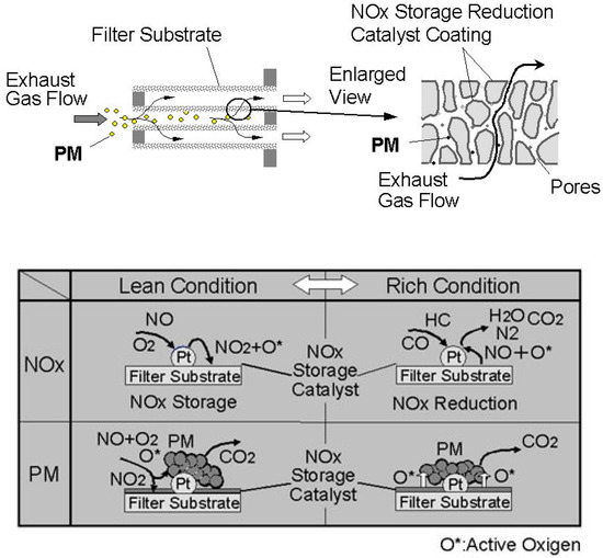 - Choi, B.; Lee, K.-S. LNT/CDPF catalysts for simultaneous removal of NOx and PM from diesel vehicle exhaust. Chem. Eng. J. 2014, 240, 476–486. [Google Scholar] [CrossRef]