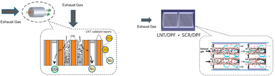 - Kang, W.; Choi, B.; Jung, S.; Park, S. PM and NOx reduction characteristics of LNT/DPF + SCR/DPF hybrid system. Energy 2018, 143, 439–447. [Google Scholar] [CrossRef]