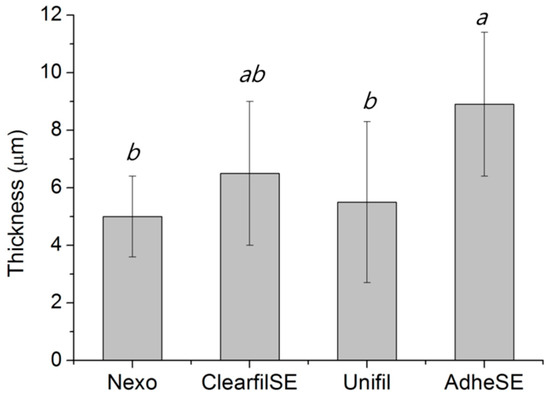 Thickness of bonding agent (μm). The same letters mean no significant differences. Raw data are presented in Table S1.