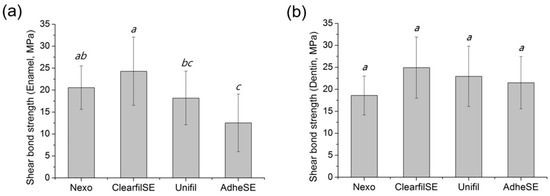 Shear-bond strength to enamel (a) and to dentin (b). The same letters mean no significant differences. Raw data are presented in Tables S4 and S5.