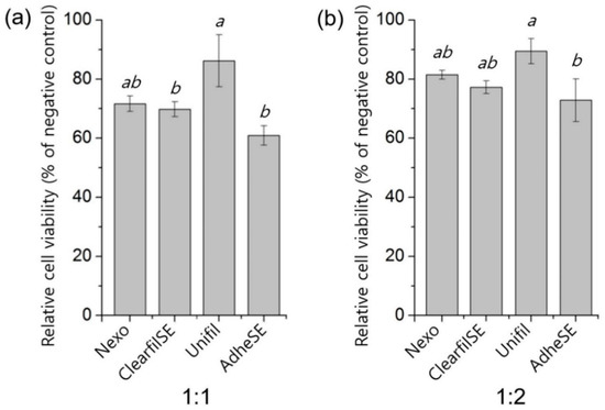 To make sure there is no problem in the cytotoxicity of each group, the MTT assay was performed according to ISO 10993-5 [11]. The results of the MTT assay are shown in Figure 5. The ratio in blanks, 1:1 means 100% of extraction, and 1:2 means extraction and non-serum media ratio. The MTT assay of all groups was shown to be over 60% of relative cell viability in 1:1 except AdheSE.
