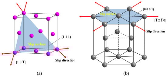 By comparing the Ti layers in the Ti/Al laminated composites in the three directions, it can be seen that the grains of the Ti layers were equal in cross-sections from the three directions, and the arrangement of the grains was relatively uniform did not have an obvious anisotropy. A large number of twins were produced in the Ti layers. The closer to the interface area, the more pronounced the phenomenon of twinning was, which was also reported in other studies [23,24,25]. Ti is a hexagonal close-packed crystal with only three slip systems in its crystal lattice. Therefore, the plastic deformation ability of Ti is weak, and dislocation slip does not occur readily [26,27]. During the rolling deformation process of the Ti/Al laminated composites, the tangential deformation force generated in the Ti layers exceeded the critical shear stress for twinning due to the large deformation force. Thus, in addition to the slippage of the Ti layers, there were also a large number of twins. Figure 4b, shows a schematic diagram of a Ti lattice slip system.