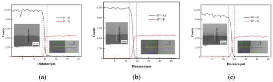 Figure 3 shows the results of the optical microscopy analysis of the microstructure near the Ti/Al interface in the cross-section of the Ti/Al laminated composites in the 0°, 45° and 90° directions. It can be clearly seen from Figure 3 that the Ti/Al interface was approximately straight. The crystal grains on both sides of the interface were relatively uniform, and the bonding interface was in good condition.