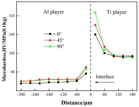 By comparing the microhardness in the areas near Ti/Al interface of the Ti/Al laminated composites in the 0°, 45° and 90° directions, it can be seen that the hardness in the 45° and 90° directions were basically equal, and the hardness in the 0° direction was slightly lower than that in the 45° and 90° directions. In accordance with the analysis above, grains in the Ti and Al layers in the Ti/Al laminated composites were preferentially oriented toward the rolling direction. The grains in the Ti/Al laminated composites in the 0° direction were elongated, and in the 45° and 90° directions, they were approximately equivalent and arranged in a regular fashion. It can be concluded that the microhardness along the rolling direction or in the grain elongation direction was lower than that in other directions. For the Al layer in the Ti/Al laminated composites, the microhardnesses along the 0°, 45° and 90° directions were obviously different. This may be because of the high plasticity of the Al layer, which led to a substantial plastic strain and obvious strain hardening during the rolling deformation process. For the Ti layer, the microhardnesses along the 0°, 45° and 90° directions were not significantly different. This may be because of the poor plasticity of the Ti layer, which led to a low plastic strain and lack of an obvious strain hardening during the process of rolling deformation. This is consistent with the conclusions above.