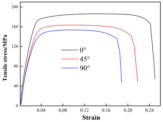 At ambient temperature, Ti crystals have a close-packed hexagonal structure [6,7,8], and Al crystals have a face-centered cubic structure [9]. During the rolling deformation process, grains are elongated along the rolling direction and are compressed perpendicular to the rolling direction. The grains inevitably undergo a preferred orientation to form a wire texture or a sheet texture [10,11,12]. The texture impacts the mechanical properties of materials in different directions. Materials used for practical engineering applications are generally in a biaxial stress state or a three-dimensional stress state. The mechanical properties of materials in certain directions may be weakened, which hinders the engineering application of the material. In addition, for materials used in engineering applications, it is possible to overestimate the mechanical properties of a material if the influence of a microstructural anisotropy is not considered. This may cause premature damage and fracture of the materials in their regular service life, which could result in significant safety hazards.