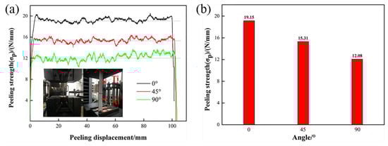 The results of the peel test. (a) peeling strength-displacement curves of the composites, (b) peeling strength with different angle of the composites.