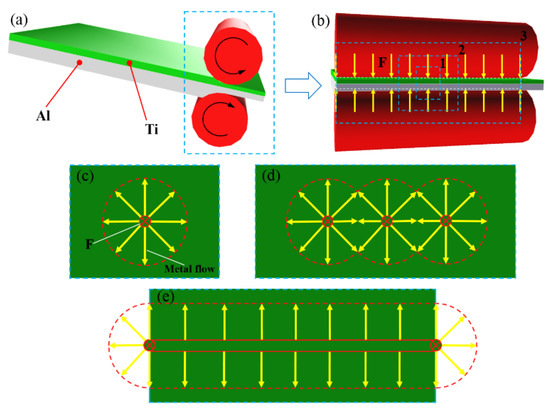 Metal flow schematic diagram of the Ti/Al laminated composites during rolling process. (a) rolling process, (b) stress distribution on the surface of the metal sheets, (c) metal flow at frame line 1 (single-point compression) in Figure 11b, (d) metal flow at frame line 2 (three-point compression) in Figure 11b, (e) metal flow at frame line 3 (line compression) in Figure 11b.