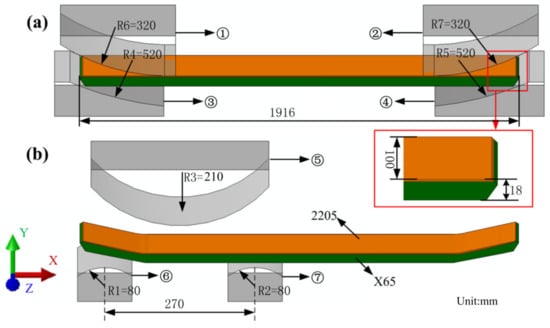 Piping systems play a critical role in the transportation of chemicals, both liquids and gases, from one location to another. The residual stress produced in the process of pipe manufacturing accelerates the corrosion, fatigue, and creep failure of pipes [,], which cause enormous economic losses. Bimetallic pipes, in which two materials are metallurgically bonded, combine the advantages of corrosion resistance and economic viability, so that they are widely used in petroleum, nuclear power, offshore platforms, and pharmaceutical fields []. In these mechanically bonded pipes, under large bending loads, the liners undergo plastic deformation, which results in non-reversible liner wrinkling. This wrinkling impedes the flow and significantly reduces the performance of the pipeline []. Pipes are classified into ERW, JCO, and UOE pipes according to their cold forming processes. JCO forming is one of the common methods of manufacturing welded pipes. The JCO pipe manufacturing processes are composed of pre-bending forming, JCO forming, welding, and expansion stages. During the pre-bending forming stage, the plate edges are bent into circular arcs over a width of approximately one radius on each side. Subsequently, the plate is formed into a J-shape, then pressed into a C-shape by progressive a multi-step air bending, and, finally, is formed into an O-shape. Therefore, the JCO forming quality depends on the deformation of the air bending. The JCO process is adaptable, economical, and suitable for medium-scale production. It has been widely used in the Panyu–Huizhou pipeline, Shaanxi–Beijing pipeline, Zhongwu pipeline, West–East Gas Pipeline Project, and other land pipelines of China [,,,].