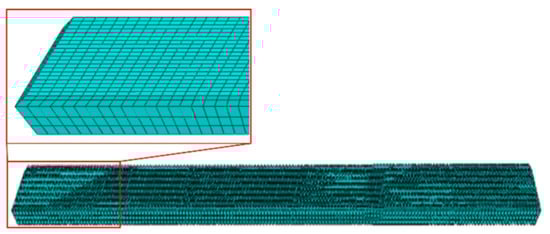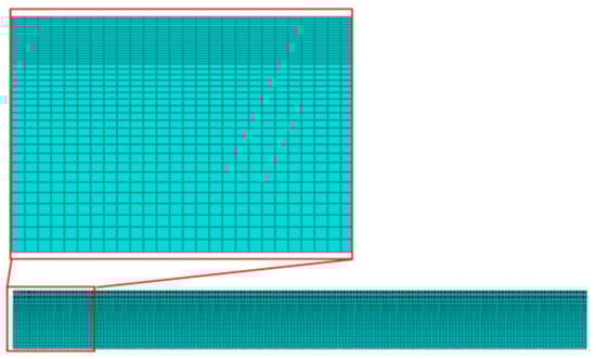 A 3D simulation is time-consuming and difficult to converge. If a 2D model could be used instead of a 3D model to study pipe pre-bending and the JCO forming process, the simulation time can be significantly reduced and the convergence of the computation will be improved Figure 18 depicts the 2D FE model for the JCO forming. The divided mesh of the plate is shown in Figure 19. The maximum element size is 1 mm × 1 mm, the minimum element size is 0.2 mm × 1 mm, and a total of 76,480 elements are divided. The element type is CPS4R, which is a four-node plane strain reduced integration quadrilateral element in ABAQUS. According to the delamination tensile test results of the 2205/X65 explosive welded bimetallic plate, the 2205/X65 plate is divided into four layers: 2205, transition layer, X65-1, and X65-2, from the upper surface to the lower surface. The thickness of the first three layers is 1.2 mm and of the fourth layer is 14.4 mm. The material properties of each layer are displayed in Figure 2. The other settings of the 2D model are the same as those of the 3D model.