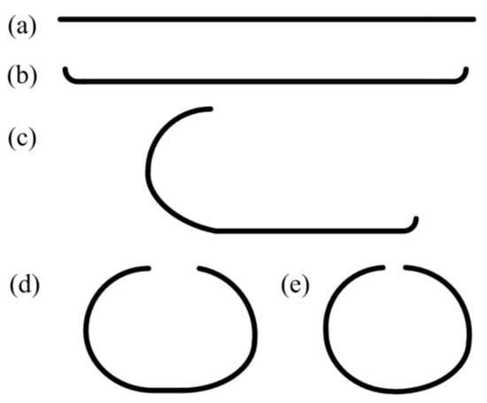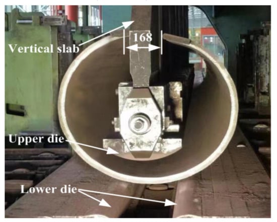 ERW pipes are produced from roll forming, which is an economical and highly productive method in plate forming technology. The finite element (FE) method has been widely used in the design and implementation of metal forming to predict the distribution of the stress and strain in the formed part [,]. Kim et al. [] established a rigid–plastic FE model to predict the edge shape of the initial strip for a thick tube roll forming. Jiang et al. [] simulated the entire rolling forming process of a cage using an explicit elastic–plastic FE model, and studied the strip deformation. The UOE process is the most effective method for manufacturing large-diameter, thick-wall, and high-strength longitudinally submerged arc welded pipes. Ren et al. [] established a two-dimensional (2D) FE model of the UOE forming process. The effects of the process parameters, friction coefficient, and material properties on the slotting and ellipticity were studied numerically.