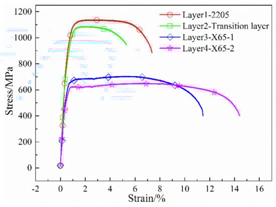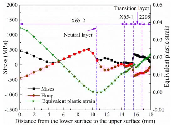 To study the stress distribution at the interface of 2205 and X65, a path from the lower surface to the upper surface along the thickness direction, which is located at the center of the pressing position of the die, was selected. The stresses and strain distributions of the JCO forming after unloading were studied. The results are displayed in Figure 21. From the distribution of the equivalent plastic strain, it can be inferred that the deformation of the lower surface is the largest, followed by that of the upper surface. The equivalent plastic strain is 0 at 10.5 mm from the lower surface. This is also the neutral layer of the plate bending forming. The neutral layer of the bimetallic plate bending is closer to the 2205 layer, which has greater strength, whereas the neutral layer of a single metal plate bending is generally located in the middle of the thickness direction of the plate. The maximum Mises stress of the whole plate after the unloading is located 9.5 mm from the lower surface. After unloading, the hoop stress presents a compressive stress on the lower surface. With the increase in the distance from the lower surface to the upper surface, the compressive stress gradually decreases to 0 at a 4 mm location and then turns into tensile stress, which then increases. The tensile hoop stress reaches the maximum at a 9.5-mm location, then rapidly decreases to compressive stress, and, finally, the hoop stress also exhibits a compressive stress distribution on the upper surface. After unloading, the residual Mises stress distribution on the neutral layer is about 180 MPa, and the hoop stress is about 140 MPa. It can also be seen from Figure 21 that the stress changes abruptly at the interfaces of X65-2 and X65-1, X65-1 and the transition layer, and the transition layer and 2205, whereas the equivalent plastic strain does not change remarkably at the interfaces of the different materials.