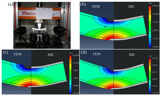 To validate the established FE model of the sheet metal bending, an FE model with the same material composition, material properties, and FE settings as those mentioned in Section 2 was established. These were in addition to its length of 210 mm, width of 20 mm, and span of 164 mm. Based on a three-point bending experiment, the bending process of the explosive composite plate was tested using an XJTUDIC 3D digital speckle dynamic strain measurement and analysis system. The strain test equipment is displayed in Figure 5a. The XJTUDIC 3D digital speckle dynamic strain measurement and analysis system is based on the 3D digital speckle correlation method. In combination with the binocular stereo vision technology, two high-speed cameras are used to capture the speckle images in real-time at each deformation stage of an object. The digital speckle correlation algorithm is continuously improved to match the deformed points on the surface of the object. Three-dimensional coordinates of the matching points are constructed. Finally, the displacement field data are computed and processed, and the deformation information is visualized. Nixon et al. [] had measured the strain of a high-purity titanium material in a four-point bending test by the DIC method, and compared it with the results of the FE method. In this study, the plate size, material composition, forming parameters, and FE model used in the experiment are the same. The experimental results of the DIC algorithm are compared to those of the FE method. The horizontal component of the true strain is extracted when the plate is depressed to the lowest point, and the cloud image is divided into the same regions. The strain range is adjusted to the same extent, and a contour map is drawn. Finally, the experimental results of the DIC and simulation results of FEM with press amounts of 20 mm, 21 mm, and 22 mm are compared. The comparison of the axial strain results is shown in Figure 5b–d. From the figure, it can be seen that the results of the DIC test and FE simulation are in good agreement, which exhibits the validity and reliability of the established FE model. Table 3 lists the spring-back and bending angle of the plate after unloading as obtained by the DIC and FEM. From Table 1, it can be seen that the relative errors between all the results of the DIC experiment and FE simulations are within 5%, which again verifies the validity and reliability of the FE model.