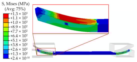Pre-bending is the first bending process of the JCO forming of the pipe. The result of pre-bending directly affects the following welding process and the quality of the pipe. The calculation steps can be described as follows: first, the plate is moved up to the pre-bending die, and then the lower die (punch) is moved upward while the upper die is kept stationary until the plate is pressed against the die. This is followed by unloading, then the plate is moved to the JCO forming die to complete the JCO forming of the pipe. The pre-bending simulated results are shown in Figure 6 and Figure 7. Figure 6 is the Mises stress contour of the pre-bending after loading, where the maximum Mises stress reaches to 1300 MPa, which exceeds the yield strength of the plate. The maximum stress appears on the upper surface of the plate. After unloading, the plate shows a certain degree of springback deformation. The maximum Mises stress drops to 490 MPa, which is located at the upper surface of the plate, as shown in Figure 7.