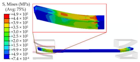Figure 20 presents the simulated result of the 2D FE model. Comparing Figure 20 with Figure 9 are veals that the Mises stress distributions of the 2D and 3D models are almost the same in the direction of the plate thickness, and there is little difference in the magnitude of the stress. However, the 2D model does not show stress distribution in other directions of the plate, such as the upper surface of the plate, i.e., the inner surface of the pipe, which is directly in contact with the corrosive medium during service. The stress state of the inner surface is a key point in the study of the pipe stress, and so, a 2D model cannot replace a 3D model. If only the thickness direction of the stress distribution is of concern, then a 2D model can be employed because it is easier to converge than a 3D model and the calculation time is much shorter than that of the 3D model. In addition, because comparatively much smaller meshes can be divided in a 2D model, it is more suitable to study the local stress distribution. If more comprehensive results are desired, a 3D model is recommended.