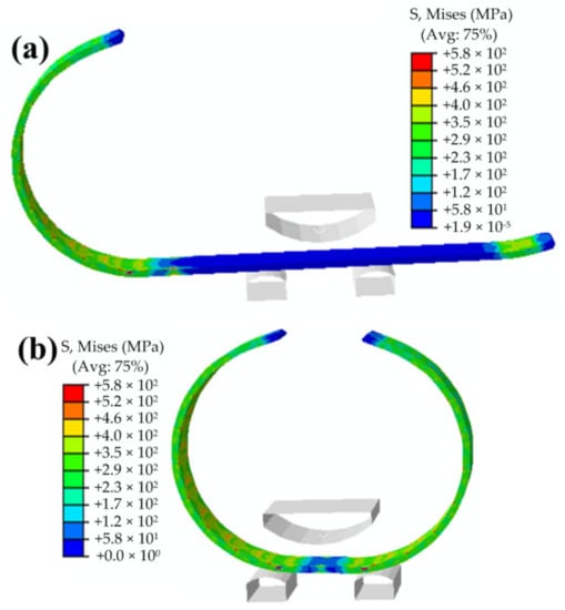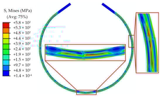 Figure 8a and bare the Mises stress contours after the “J” forming and “C” forming, respectively. Figure 8a,b are the stress and equivalent plastic strain (PEEQ) contours after the “O” forming, respectively. From these figures, the stress distribution and PEEQ distributions of the pipe during the forming process can be visually seen. From Figure 8, it can be seen that the stress and equivalent plastic strain on the pipe present segmented distributions. The values and distributions of the stress and PEEQ of each segment are basically the same, except for the middle part of the plate. The last step of the pipe forming is the “O” forming. The pressing of the middle part is a symmetrical bending forming, whereas the other steps are asymmetrical bending forming. Hence, the stress and deformation in the middle of the plate are different from those in the other parts. The stress and PEEQ in the middle part of the plate, i.e., the pressing position of the “O” forming, are larger than those in the other parts. Moreover, the number of segments is consistent with the pressing time. From Figure 9a, it can be observed that a large residual Mises stress is distributed on the inner surface and in thickness direction of the pipe. It can be noted from Figure 8b that each segment has a region of zero PEEQ, indicating that the formed billet is composed of circular and straight sections, which are separated. Further, there is also a zero PEEQ part in the thickness direction. This is the neutral layer of the plate bending forming, which is located close to the 2205 side, and not in the middle of the thickness direction. This is also the difference between bimetallic pipe bending forming and single metal pipe bending forming.