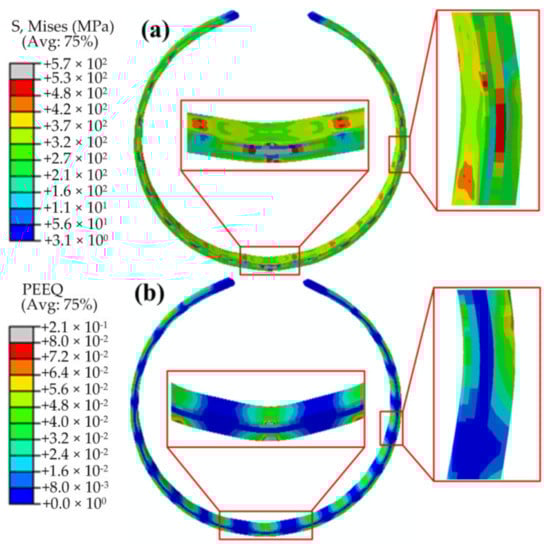 Mises stress and equivalent plastic strain (PEEQ) contours of the “O” forming: (a) Mises stress and (b) PEEQ.