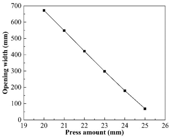 Because of the restriction of the vertical slab on the top of the JCO upper die, as shown in Figure 10, the opening width of the pipe billet should be more than 110 mm. To ensure the following welding quality and reduce the residual stress, the opening width of the pipe after forming should be less than 260 mm. The press amount of the upper die is one of the key parameters determining the opening width of the pipe billet. To obtain the ideal opening width, press amounts of 20 mm, 21 mm, 22 mm, 23 mm, 24 mm, and 25 mm are studied. It can be seen from Figure 11 that, when the other factors are unchanged, the opening width decreases linearly with the increase in the press amount. It also can be noted from Figure 10 that the opening width of the pipe billet is 180 mm when the press amount of the JCO upper die is 24 mm, which meets the requirements of pipe forming. Therefore, the appropriate press amount of the JCO upper die is 24 mm. Based on the process parameters simulated by the FE method, a 2205/X65 bimetallic pipe of the same size was manufactured by the JCO forming process, as shown in Figure 10. The opening width is an important technical index for the quality control of the pipe forming, which reflects the deformation of the pipe, which in turn reflects the stress to a certain extent. Therefore, the experimental and simulation results of the opening width are compared. The opening width of the manufactured pipe is 168 mm, which is slightly smaller than the simulation result; however, it meets the requirements of pipe forming.