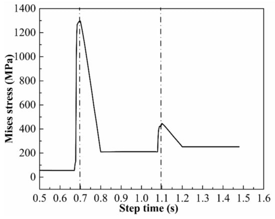 To study the evolution of the plate stress during the JCO forming, a node was selected, which was located at the center of the upper surface of the plate at the first pressing position of the die. As shown in Figure 12, 0.6–0.7 s is the first downward pressing time, and the stress at this node increases rapidly with the downward pressing of the die. The upward time of the die is 0.7–0.8 s, and it can be observed from the figure that the elastic recovery of the plate occurs with the upward pressing of the die, and the stress decreases from 1300 MPa to 210 MPa. The second downward pressing time of the die is 1.0–1.1 s, and it can be noted from the figure that the maximum Mises stress of the plate increases from 210 MPa to 406 MPa during this time. The Mises stress at this node changes by 42 MPa after the first and second upward pressings of the die, and the subsequent upward–downward pressing processes of the die and the movement of the plate do not affect the stress at this node.