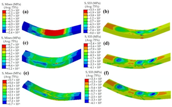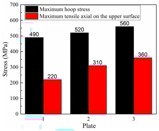 Compared with the normal 2205 and X65 metals, the strength of the plate in this study is significantly improved, and the strength of the same batch of plate should also be different. To study the influence of the strength change of the plate on the stress during the pipe forming, three types of plates with different strengths were selected to study. Plate 1 had the strength of the X65 and 2205 plates before the explosive welding, plate 3 had the strength of the X65 and 2205 plate after the explosive welding, and plate 2 had the average strength of the plate before and after the explosive welding, which is summarized in Table 4. The results are shown in Figure 15. It can be observed from Figure 15 the maximum hoop stress and the maximum tensile axial stress on the upper surface increase with increasing plate strength. Comparing plate 3 with plate 1, the maximum hoop stress increases by 70 MPa and the maximum tensile axial stress increases by 140 MPa. Therefore, the change in the plate strength has a large influence on the stress level of the formed pipe.