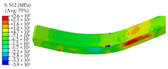 From the above research results, it can be understood that the stress distributions of the plate after the forming are segmented, and the values and distributions of the stresses in each segment are basically the same, which are mainly determined by a single downward pressing and upward of the die. Therefore, a downward–upward pressing process of the die can be selected to study the stress evolution of the JCO forming process of the plate. If a large tensile stress that is perpendicular to the thickness of the plate distribution is present on the inner surface, then the service life of the pipe will be seriously affected. The axial stress is along the width direction of the plate, which is the only large residual tensile stress in the inner surface that is perpendicular to the thickness of the plate; therefore, it is chosen as a representative stress to study the effects of the pipe size and forming parameters on the stresses after forming Figure 13 is exhibiting the evolution of the stress distributions of the plate after loading, unloading, and moving the plate forward. The Mises stress distribution after loading in the JCO forming process is the same as in the pre-bending process, and the stress on the upper surface is much larger than that on the lower surface, as shown in Figure 13a,b. It can be noted from Figure 13c,d that the plate exhibits remarkable elastic-recovery deformations and that the maximum Mises stress decreases to 670 MPa with the die upward pressing. The maximum Mises stress distributes on the upper surface edge of the 2205 stainless steel plate. In addition, the plate near the bottom of the X65 steel layer also has a large residual stress in the thickness direction. The axial stress distribution is complex, and there are compressive stresses and tensile stresses on the upper surface, with the maximum axial tensile stress of 240 MPa. It can be seen from Figure 13e,f that the distributions of the Mises stress and axial stress change little with the plate moving forward, and their values decrease slightly compared to that in the die upward stage. By studying the maximum shear stress in the forming process and comparing it with the tested shear strength, the bonding behavior of the bimetallic plate in the JCO forming process can be understood. The maximum shear stress in the JCO forming process of the pipe is shown in Figure 14. The maximum shear stress is 250 MPa, which is located in the thickness direction close to the 2205 layer. According to Zhang et al. [], the average shear fracture strength of a bimetallic plate after explosive welding is 400 MPa. The maximum shear stress of the pipe in the JCO forming process is much less than the tested shear strength of the plate. The plate is still well bonded after the JCO forming process and has no interface separation.