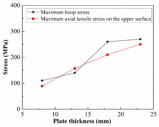Four thickness sizes of 8 mm, 13 mm, 18 mm, and 23 mm were selected to study their influence on the stress of the bimetallic pipe after the JCO forming. The 2205 stainless steel layer maintained a thickness of 2 mm. As shown in Figure 16, the plate thickness has a significant influence on the maximum hoop stress and the maximum axial tensile stress on the upper surface of the plate after the forming. With the increase in the plate thickness from 8 mm to 23 mm, the maximum hoop stress increases from 110 MPa to 270 MPa, and the maximum axial tensile stress on the upper surface of the plate increases from 89 MPa to 250 MPa. It can be concluded from the above results that, with the increase in the plate thickness, the maximum tensile axial stress on the upper surface after the JCO forming increases linearly, whereas the hoop stress increases first and then tends to be stable.