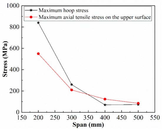 Finally, the influence of the span on the stress of the bimetallic pipe after the forming was studied. Four spans: 200 mm, 300 mm, 400 mm, and 500 mm, were selected for this. With the increase in the span, the maximum hoop stress and the maximum tensile stress axial on the upper surface of the plate decrease significantly, as shown in Figure 17. With the increase in the span from 200 mm to 500 mm, the hoop stress decreases from 870 MPa to 340 MPa and the maximum axial tensile stress decreases from 550 MPa to 85 MPa. When the span is 200 mm, the plate deforms severely. The results show that, with the increase in the span, the maximum tensile axial stress on the upper surface of the plate reduces significantly, whereas the hoop stress decreases first and then remains unchanged.