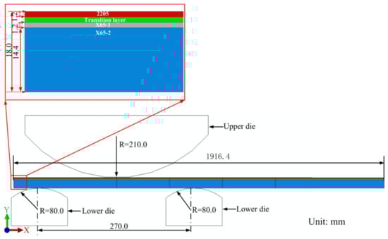 FEM of the JCO forming process of a pipe is a multi-non-linear (material, geometric, and contact non-linear), elastic–plastic and, large-deformation problem, and few studies have been conducted on the bending of a bimetallic plate. X65 pipe steel (X65) offers high strength, high toughness, and a minor Bauschinger effect; 2205 duplex stainless steel (2205) is particularly suitable for the production of the stainless steel bimetallic plate for use in oil and gas transportation pipes and refining equipment; 2205/X65 bimetallic plate is fabricated by the explosive welding technique, the interface of explosively welded 2205/X65 bimetallic sheet exhibited reliable and robust shear strength and bending properties, and a metallurgical combination is formed between 2205 and X65, which has been investigated by Zhang et al. []. Gou et al. [] studied the butt-welding process of a 2205/X65 bimetallic plate. Dong and Zhang [] investigated circumferential welds made of a 2205/X65 bimetallic pipe. In this study, using ABAQUS commercial FE calculation software, the pre-bending and JCO forming FE models of a 2205/X65 bimetallic pipe were established. The FE simulation results were compared to the results measured by digital image correlation (DIC) techniques to validate the model. The stress distribution and shape of the 2205/X65 bimetallic pipe after the pre-bending and JCO forming were obtained by calculation. Furthermore, the stress evolution in the process of the JCO forming and the effect of the material strength, plate sizes, and forming parameters on the stresses were studied. The interfacial stress distribution of different materials was analyzed by a 2D model with fine grids, and the simulated results of the 2D and 3D models were compared. Moreover, the free bending characteristics of bimetallic plates were highlighted.