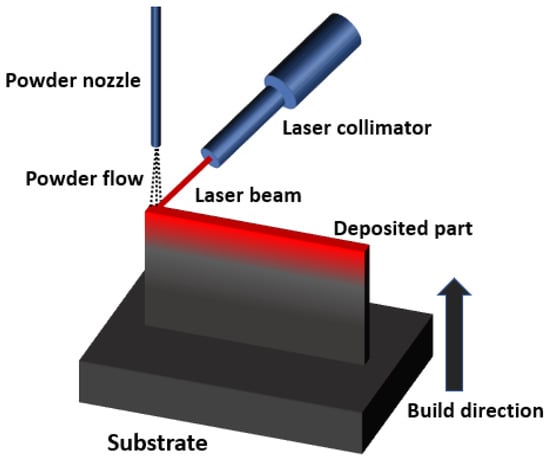 During the past decade, typical metal alloys fabricated by DED has been studied. These alloys include austenitic stainless steels (304/304L [8,9] and 316/316L [10,11]), precipitation hardening stainless steels (17-4 PH [12]), nickel-based superalloys (Inconel 718 [13,14] and Inconel 625 [15,16]), titanium alloys (Ti-6Al-4V [17,18,19,20]), etc. DED and PBF have their own advantages according to their special features. For DED, it is able to build parts on a non-flat surface while PBF usually needs a horizontal area for powder spreading. Thus, modification of the curved surface and repairing of damaged parts are also possible using the DED process [21,22,23]. The part remanufacturing can be collaborated with reverse engineering to repair damaged parts by constructing a damaged profile and determine the laser scanning strategy, which will be of great significance in saving cost on tooling [24,25]. As an in-situ powder feeding process, it has the potential to fabricate parts without an enclosed chamber [26]. Therefore, the volume of building parts can be much larger than the PBF process. One more important feature is because of the in-situ powder feeding process, DED can flexibly create different material compositions from layer to layer by mixing different powders; however, this is difficult to be realized in PBF. Therefore, much more metallic alloys with various compositions can be potentially directly created by taking this advantage of DED. This novel aspect of DED will be the main topic to review in this article.