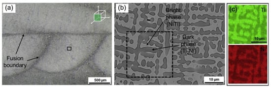 (a) Microstructure and fusion boundary of NiTi alloy fabricated by DED using elemental powder blends. (b) SEM image of the NiTi alloy with NiTi phase and Ti2Ni phase. (c) EDS mapping of Ti and Ni [49]. (Reproduced with permission from Elsevier).