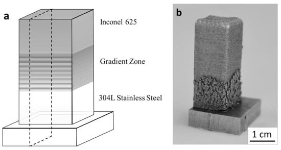 (a) Schematic of Inconel 625/304L stainless steel FGM. (b) Image of an Inconel 625/304L stainless steel FGM sample fabricated by DED [61]. (Reproduced with permission from Elsevier).