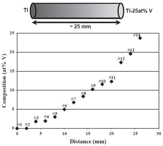 Schematic diagram of Ti-25 at.%V FGM alloy fabricated via elemental powder mixture and the compositional variation vs. distance [65]. (Reproduced with permission from Elsevier).
