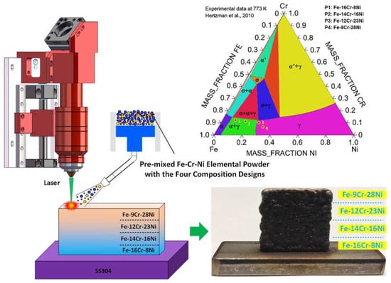 - Li, W.; Chen, X.; Yan, L.; Zhang, J.; Zhang, X.; Liou, F. Additive manufacturing of a new Fe-Cr-Ni alloy with gradually changing compositions with elemental powder mixes and thermodynamic calculation. Int. J. Adv. Manuf. Technol. 2017, 95, 1013–1023. [Google Scholar] [CrossRef]