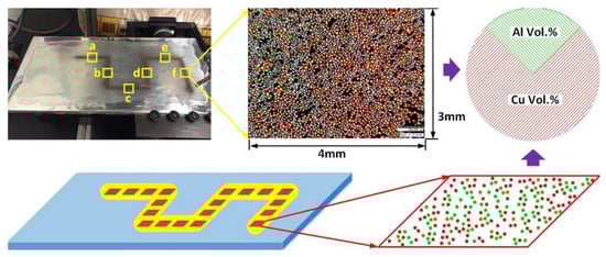 Investigation of powder segregation between Al powder and Cu powder by spraying powder mixture on a glue plate and calculating the volume ratio of Al powder and Cu powder at different locations [96]. (Reproduced with permission from Elsevier).